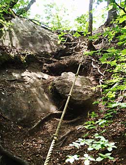 急坂になり↑、先の岩の脇を通ります。脇を巻く道から岩を見上げたところですが↑、近くて全体がはいらないので二枚の写真を合成したため、ずれて木が切断されてしまいました。 近くの割れた板の文字を判読したところでは鏡岩という名前のようです。後で写真を見たら矢印らしいものも書いてあるので、上に登る道があったのかもしれません。 |
