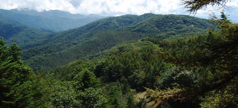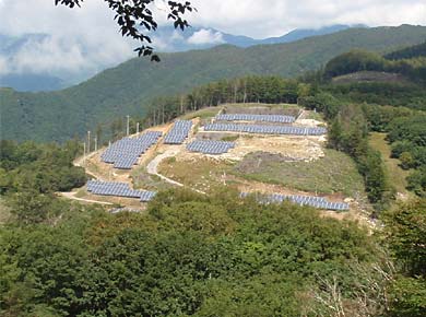 ![]() 案内地図では、三窪高原を北に下りた板橋峠というあたりの西側に「深静峡」とあり、何か哲学者のような人達の別荘地かと思っていましたが、見下ろしたところ建物などは無く、広い山地が一面の太陽光発電のパネルでおおわれていました(↓写っているのは一部です)。 板橋峠まで林道を車ではいれるとありましたが、帰りに通ると青梅街道入口の扉がしまっていました。↓板橋峠の車止めの柵。左側が立ち入り禁止の私有地「深静峡」。柵をすり抜けて先に進みます。 |
