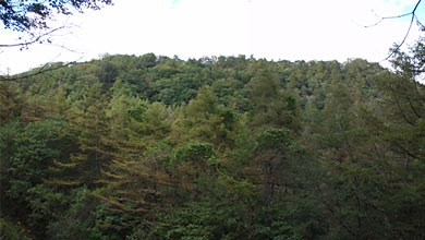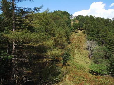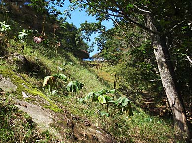 その道(というより踏み跡)は東京都水道局の水源監視道といったもので、危険な所はないものの、尾根の背の境界標を忠実にたどって地形どおりに上り下りするので、老人には歩きごたえのある道でした↑。