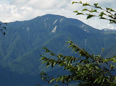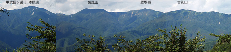 ↓この辺からの奥秩父連山の眺め。左手の高い山が唐松尾山で、右手のくぼんだあたりが将監峠(しょうげんとうげ)かと思われます。