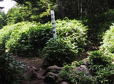 ![]() 峠から15分ほど登った所で、「大石峠旧跡」とあります。諏訪と佐久を結ぶ道の峠で、今は廃道とのこと。 正面右手を登った、 「中小場」という高みからの茶臼山↓。 |