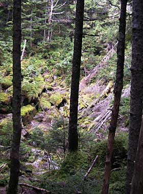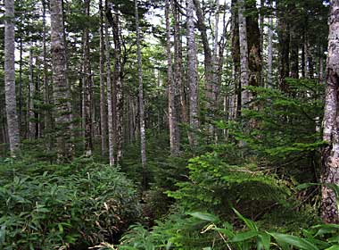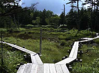 30分ほどで大石川林道に下ります→。閉鎖されていて車の通らない静かな道を20分ほどで雨池の入口に着きます。 ↓雨池は浅い池で、夏から秋はたいてい半分くらい干上がっているのですが、今年(2006年)は雨が多かったせいか水面が広がって池が大きく見えました。 |