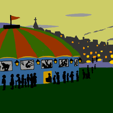 鬚(ひげ)をはやしたおとなも居れば、いちばんしまひにはペムペル位の頬のまっかな眼のまっ黒なかあいゝ子も居た。ほこりの為にお日さまはぼんやり赤くなった。