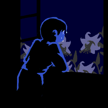 それから少ししづかな心持ちになって、足音をたてないやうに、そっと次の室にはひって見ました。交(かは)る交るさまざまの色の電光が射し込んで、床に置かれた石膏像や、黒い寝台や引っくり返った卓子(テーブル)やらを照らしました。