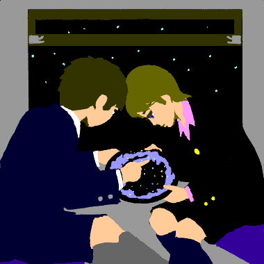 するとどこかで、ふしぎな声が、銀河ステーション、銀河ステーションと云ふ声がしたと思ふといきなり眼の前が、ぱっと明るくなって、まるで億万の螢烏賊(ほたるいか)の火を一ぺんに化石させて、そら中に沈めたといふ工合(ぐあひ)、またダイアモンド会社で、ねだんがやすく