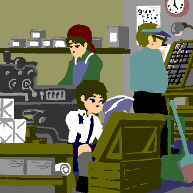 家へは帰らずジョバンニが町を三つ曲ってある大きな活版処にはひってすぐ入口の計算台に居ただぶだぶの白いシャツを着た人におじぎをしてジョバンニは靴をぬいで上がりますと、突き当りの大きな扉(と)をあけました。中にはまだ昼なのに電燈がついてたくさんの輪転機がばたりばたりとまはり、きれで頭をしばったりラムプシェードをかけたりした人たちが、何か歌ふやうに読んだり数へたりしながらたくさん働いて居りました。