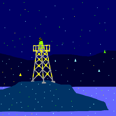 川は二つにわかれました。そのまっくらな島のまん中に高い高いやぐらが一つ組まれてその上に一人の寛(ゆる)い服を着て赤い帽子をかぶった男が立ってゐました。そして両手に赤と青の旗をもってそらを見上げて信号してゐるのでした。