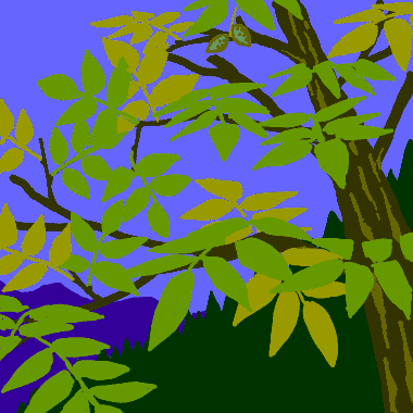 一郎はまたすこし行きました。すると一本のくるみの木の梢(こずゑ)を、栗鼠(りす)がぴよんととんでゐました。一郎はすぐ手まねぎしてそれをとめて、