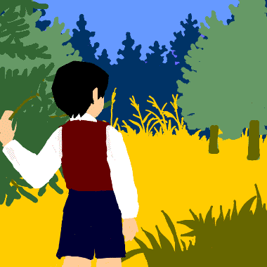 一郎がすこし行きましたら、谷川にそつたみちは、もう細くなつて消えてしまひました。そして谷川の南の、まつ黒な榧(かや)の木の森の方へ、あたらしいちひさなみちがついてゐました。一郎はそのみちをのぼつて行きました。榧の枝はまつくろに重なりあつて、青ぞらは一きれも見えず、みちは大へん急な坂になりました。一郎が顔をまつかにして、汗をぼとぼとおとしながら、その坂をのぼりますと、にはかにぱつと明るくなつて、眼がちくつとしました。そこはうつくしい黄金(きん)いろの草地で、草は風にざわざわ鳴り、まはりは立派なオリーヴいろのかやの木のもりでかこまれてありました。