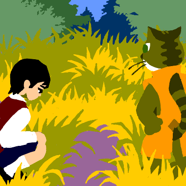 一郎はをかしいとおもつて、ふりかへつて見ますと、そこに山猫が、黄いろな陣羽織のやうなものを着て、緑いろの眼をまん円にして立つてゐました。やつぱり山猫の耳は、立つて尖(とが)つてゐるなと、一郎がおもひましたら、山ねこはぴよこつとおじぎをしました。一郎もていねいに挨拶(あいさつ)しました。