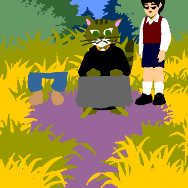 馬車別当が、こんどは鈴をがらんがらんがらんがらんと振りました。音はかやの森に、がらんがらんがらんがらんとひゞき、黄金のどんぐりどもは、すこししづかになりました。見ると山ねこは、もういつか、黒い長い繻子(しゆす)の服を着て、勿体(もつたい)らしく、どんぐりどもの前にすわつてゐました。まるで奈良のだいぶつさまにさんけいするみんなの絵のやうだと一郎はおもひました。別当がこんどは、革鞭(かはむち)を二三べん、ひゆうぱちつ、ひゆう、ぱちつと鳴らしました。 |