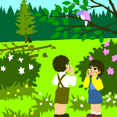 お母さんが、家の前の小さな畑に麦を播(ま)いてゐるときは、二人はみちにむしろをしいて座つて、ブリキ缶で蘭(らん)の花を煮たりしました。するとこんどは、もういろいろの鳥が、二人のばさばさした頭の上を、まるで挨拶するやうに啼きながらざあざあざあざあ通りすぎるのでした。