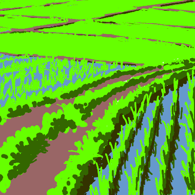 次の朝から主人はまるで気が立つて、あちこちから集まつて来た人たちといつしよに、その沼ばたけに緑いろの槍(やり)のやうなオリザの苗をいちめん植ゑました。それが十日ばかりで済むと、今度はブドリたちを連れて、今まで手伝つて貰つた人たちの家へ毎日働きにでかけました。それもやつと一まはり済むと、こんどはまたじぶんの沼ばたけへ戻つて来て、毎日毎日草取りをはじめました。ブドリの主人の苗は大きくなつてまるで黒いくらゐなのに、となりの沼ばたけはぼんやりしたうすい緑いろでしたから、遠くから見ても二人の沼ばたけははつきり堺(さかひ)まで見わかりました。七日ばかりで草取りが済むとまたほかへ手伝ひに行きました。ところがある朝、主人はブドリを連れて、じぶんの沼ばたけを通りながら、俄(にはか)に「あつ」と叫んで棒立ちになつてしまひました。見ると唇(くちびる)のいろまで水いろになつて、ぼんやりまつすぐを見つめてゐるのです。 |