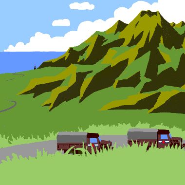 「では 引き上げよう。 みんな 支度して車に乗り給へ。」 みんなは大急ぎで二十台の自動車に乗りました。車は列になつて山の裾を一散にサンムトリの市に走りました。丁度山と市とのまん中ごろで技師は自動車をとめさせました。