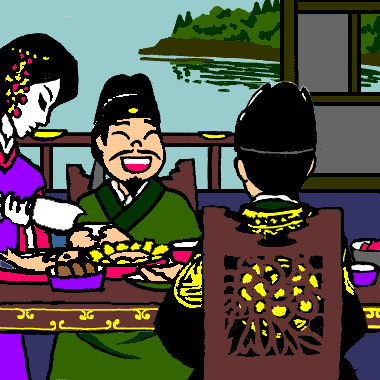 すでに並んでいた料理が片づけられ、あらたに酒食がはこばれて、美しい侍女たちが梁に酒を勧めるのでした。