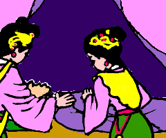女は笑って、小間使たちに命じ、宴席を寝室に移させました。