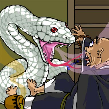 それを見て、またまた肝をつぶし目をつぶって倒れ伏したのを、ふたりはかわるがわる話しかけますが、ただ気を失ったようになって夜が明けたのでした。