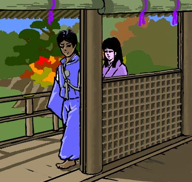 豊雄は女を見送ってから、主人の簑笠を借りて帰りましたが、夜通しその面影が浮かんで寝られず、ようやくまどろむ明け方の夢に女の家を尋ねて行けば、立派な屋敷に蔀(しとみ)やすだれを下ろして奥ゆかしく暮らしている様子です。