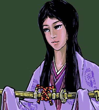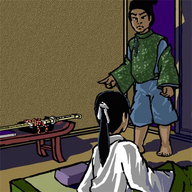 太郎(長男の呼び名)は漁のしたくのために暗いうちから起き、豊雄の部屋を通りかかると、まだ消え残る灯火に何かが光ったようなので、のぞき込んでみれば立派な太刀が枕元に置いてあります。 ![]() |
