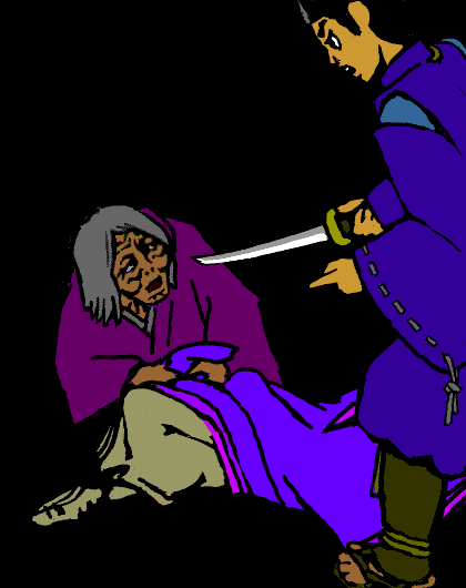 『もしかしたら生き返った死人かも知れない。脅かしてみよう』というので、そっと戸を開き刀を抜いて、 「おのれは! おのれは!」と叫んで走り寄りました。