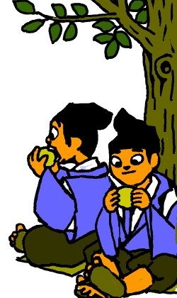 今は昔、夏の頃に、瓜をのせた何頭もの馬を引いて、下人どもが大和(奈良)から京に向かっておりました。 宇治の北にあった(実の)「成らぬ柿の木」という聖木の木陰で馬から荷を下ろして休ませ自分たち用に持ってきた瓜を取り出して食べたりしていました。 すると、その辺に住む人なのか、ひどく年老いた翁(おきな)が、ひとえの着物を紐でとめ、下駄をはき、杖を突いて出て来て、そばで扇を使いながら下人どもの様子をじっと見ていました。 しばらくして翁が、 「その瓜をひとつ、わしに恵んではもらえんかな。のどが乾いてたまらんぢゃ」