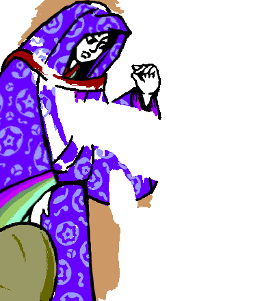 「わたくしも定まった夫はありません。宮仕えをしておりましたが、人の妻となってやめたところ、その人もいなかで亡くなりましたので、この三年ばかり、頼む人もあればと、このお社にお参りしております。でも、行きずりの人のおっしゃる事を真に受けるなんて恥ずかしいことですね。さあ、おいでください。わたくしも帰りましょう」と、女は立ち去ろうとしますから、重方は手を額の前で摺り合わせ、女の胸元に烏帽子(えぼし)の先を当てて、