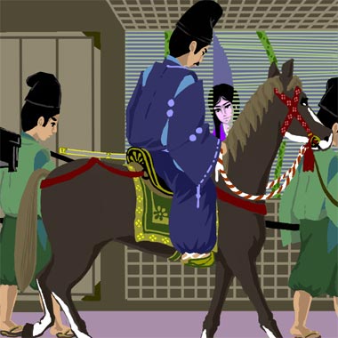 男が起きて戸を開ければ、侍ふうの男ふたりと女房(貴人に仕える女)らしい女が下女を連れてはいってきて、蔀戸をおろし、灯をともし、うまそうな食べ物を銀の食器に盛ってふたりにすすめるのでした。