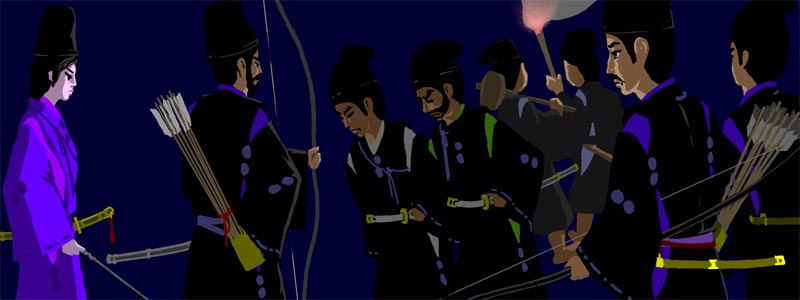 傷もすっかり治った頃、夕暮れ時に、女は黒の水干袴(すいかんばかま)と立派な弓矢、すね当て、わらじなどをそろえて男に着せ、身支度を整えさせました。