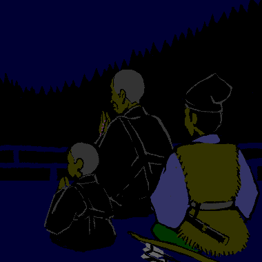 「この頃、きわめて貴いことがありますぢゃ。日頃、他の思いも無く、ひたすら法華経を読誦してきましたが、そのかいあってか、夜な夜な普賢菩薩(ふげんぼさつ)がお姿をお見せになりますぢゃ。今夜は是非、ここに泊まって、あなたも尊い御仏を拝んでゆきなされ」 |