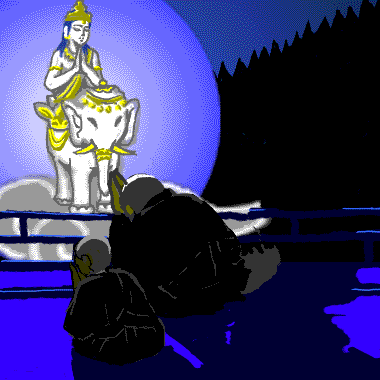 矢が菩薩の胸に立つ──と見るうちに光は消えて、谷に向かって、地響きさせて何かが逃げてゆくようすです。