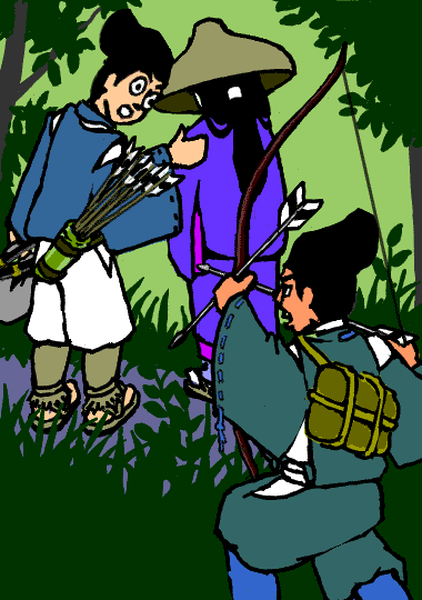 元の男も、もっともだと思い、良い刀を手に入れた嬉しさもあって、二本の矢を渡しますと、後の男はそれを持って後にたって行きます。