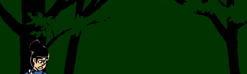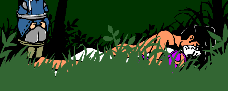 さらに「刀と脇差しを投げろ!」と命じますから、それらを投げ出すと、後の男はそばにより、元の男を組み伏せ、馬の口取りのひもで木に縛り付けてしまいました。