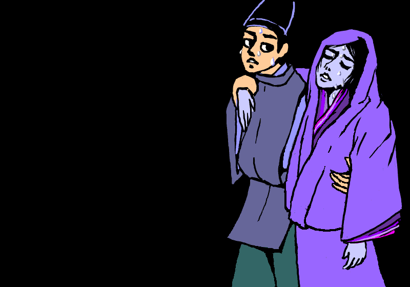 不気味で恐ろしい気配なので、大夫は起きあがって、どうなることかと見ていると、女房は一間ほど離れて脇を向いて坐りました。