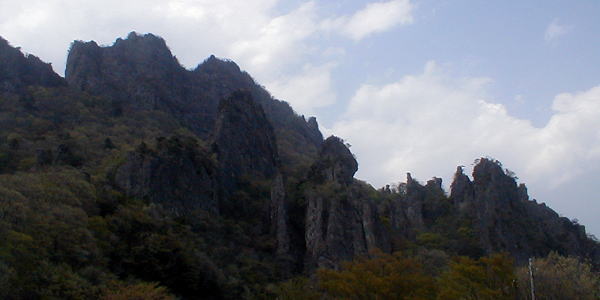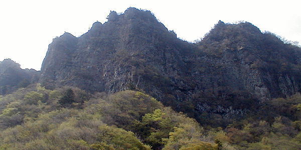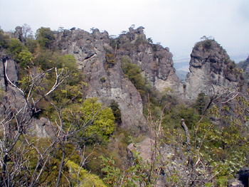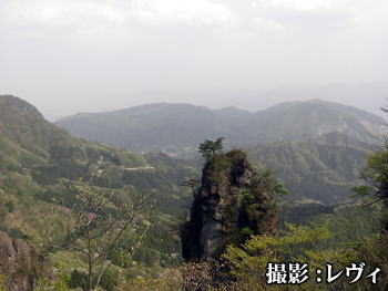 ごつごつした切り立った岩肌と大きい岩と眼下に広がる山桜。