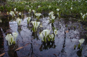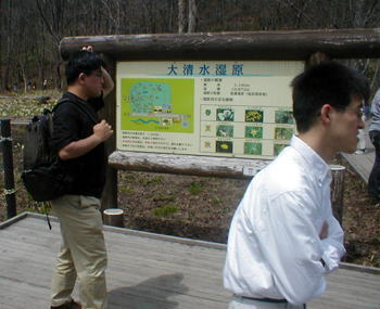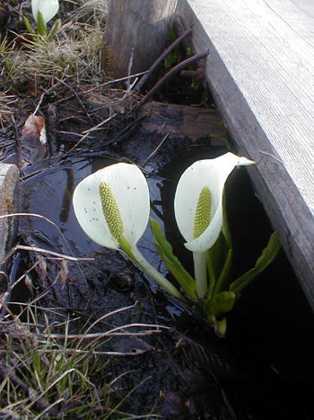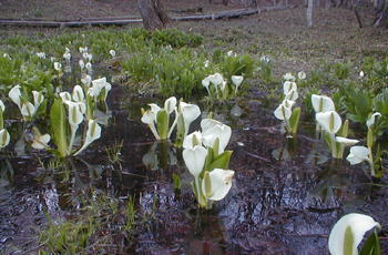 大清水湿原に到着。おお、水芭蕉が咲いてますな。一応尾瀬らしい風景です。