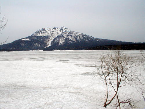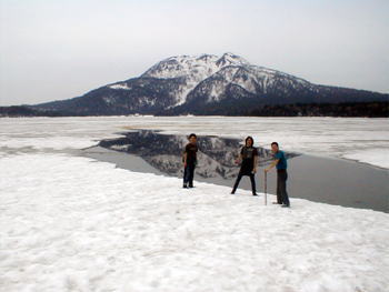 凍った沼の所々にある水面に映りこんだ燧ケ岳がきれいでした。