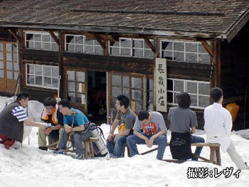 ちょうど残雪がちらほら見え始めた頃の一之瀬休憩所で一休み。