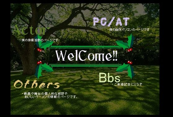ようこそいらっしゃいました! あなたは番目のお客様です お好きなお部屋をクリックしてください。 これらの部屋は、IE5のみで動作確認済みです。画面サイズは1024X768で最適化しています。 ご意見、ご感想等がありましたら masahide@tokyo.interq.or.jp まで、メールをお願いします。