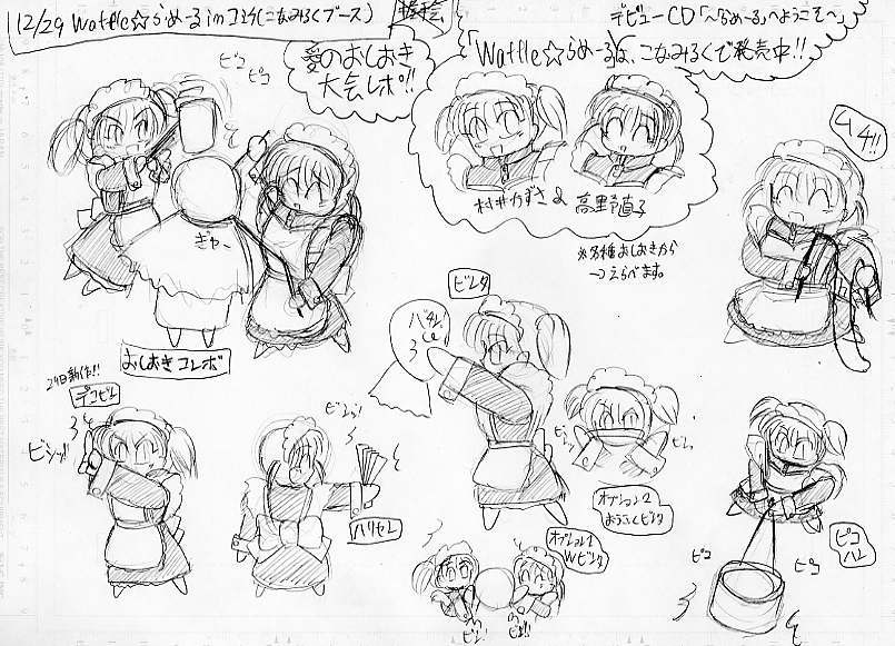 | 今日はとにかく「Waffle☆ら・めーる握手会」に参加するべく念には念を入れて早めに。 YKOさんとともに、10時10分ころには国際展示場に到着。 そして並ぶも10時25分にはもう列が動いて10分くらいでこなみるく到着。 無事に整理番号16番を確保(整理番号はあまり意味が無いんですが念のため) そしてすでに掲示板等で情報は仕入れていましたが、 「握手」以外にビンタ・ハリセン・ピコピコハンマー・ムチがあるとのことで、 たしかに印刷されたポスターにはビンタとハリセンがすでにしっかりと書いてありました。 つまり、すでに告知の段階でひっかけてきてます、こなみるく。 その後、企業のフロントウイングにコスプレイヤーのMayuさんがいるので挨拶・撮影(笑) コスプレ広場に行くには早すぎるので、昔懐かしい魔法少女スペースへ。 とても懐かしい空気がそこには漂ってましたね。 さすがにチャチャは2だけですが、かつての魔法少女は静かに生きています。 そして、11時すぎにはコスプレ広場へ 混みますねー。ぐるぐるとゆっくりと人の波が流れています。 ただあまりにも混みすぎてとてもゆっまくりみれるような状況でもなく、 今回撮らせていただいた方はほとんど以前に撮った方でした。 charmでお世話になっている、はっしーさんとか雪城はるかさんとか、エマさんくらんさん、広瀬さん、 、 あの状況なのに撮影機材とか小道具の30センチ規制なんかおかしいという人の気が知れません(笑) 荷物のカートには何回ひかれたことか(爆) ただ、2時過ぎなどはカゼがあって寒いのでコスプレイヤーさんには難儀な季節でしたね。 下記の握手会が終わった後にも回ってましたが正直、探していた人がまったく見つからず、もうぐったりでした。 やっぱりコミケは撮るところではありませんね(笑) 結局、最後になって立て続けに見つかったので目的は果たせました。 そして「握手会」13時からなので12時50分にはこなみるく前へ。 7番目くらいでまっていると、メイド服姿の村井さんと高野さんが! そし今日はメニューに「デコピン」がプラス。 そしてはじまりました、Waffle☆ら・めーるCD発売記念握手会inコミケ、 もとい、 愛のおしおき大会 (byこなみるくスタッフ) 上のリンク先にあるのはその日の夜に勢いで書き上げたレポートイラストです。 ちなみに握手した人は私は見ていません(笑) 先日のライヴで差し入れした「ら・めーるうちわ」を持って前に立ったら 高野さんが見事な反応をしてくれました。イラストの力は偉大です(笑) メッセージカードをお二人に差し入れして、私はしっかりと新作のデコピンで。 昨日もやっているせいか、それほど混むことは無いものの、しかしそれなりに人が来ており いろいろと面白くスタッフも煽ったり、お二人も元気にノリよく笑顔でした。 後のほうは途切れ途切れだったこともあって、いろいろなオプションがついたりして、 傑作はいらすとの左上の、「高野さんがムチで首をしめつつ村井さんがピコハン連射」とか。 むちはおもいっきり振るうとスペースの柱にぶつかったりするのでこれがベスト(爆) サイン会に人が居なくなった神田さんもヒマなのでムチをもってみたりと 周りに眺めている人達も飽きることなく楽しめました。 2時に終わるまで1時間見ていましたが、飽きることなくお二人のメイド姿とおしおき姿を見てきました。 3時には会場を後にして今年最後のCOS−CHAへ。 4時につきましたが10人ほど並んでいました。15分で入り。 そしてコミケシーズンらしく、一見さんが行列を見ては帰っていったりしたので もしまともに並んだら、私が入る15分間に25人は並んでいたでしょう。団体さんも居ましたしね。 エンジェルは、昨日サークル参加をしていたイヌ様、明日みれにあむキッスに来るゆきあさん、 椿さんと、たぶん新人さんでした。そして厨房からやよいさんが。 忙しいときは厨房から直接持ってくることがあるときいたことがありましたが、実際に見たのは初めてでした。 定番の自称2005円セットを頼んで今日はじめての食事をして、本日は終了しました。 いや、ホテルで勢いで上のイラストともうひとつ描いて急遽ペーパーを作ってしまいましたが。 |