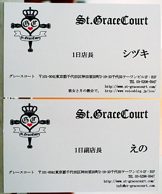 写真はシヅキ新店長名刺とえの新副店長名刺です。 店長がハリセン持ってうろついてます。 くわしくは数日後のレポで。 |