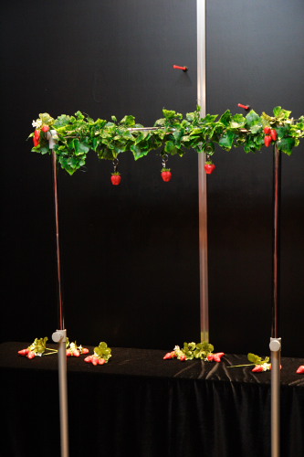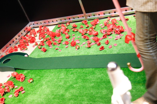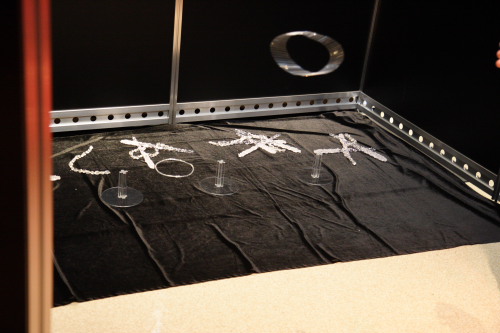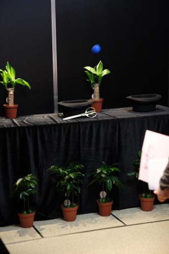 左の三脚に固定された如雨露から玉を出して盤の上をころがしてあたりに・・・・・