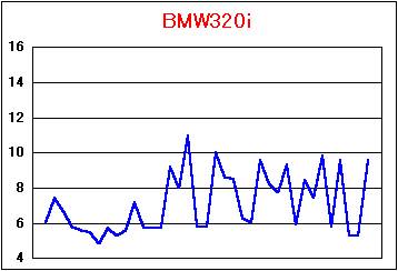 今年(2000年)の7月で購入後1年たち,12ヶ月点検をうけました。下はこの1年間のBMW320iの満タン方式による燃費グラフです。6気筒のこともあり,測定した平均燃費の結果は歴代所有した車のうちで最も悪いデータとなりました。