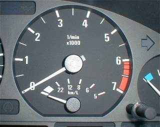 | 車内のメーター類です。中央左がスピードメーターです。ヨーロッパ車の例のように240kmまでめもられています。その左がタコメーターです。6000回転からレッドゾーンです。一番左が燃料系,一番右が水温計です。 |