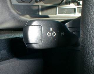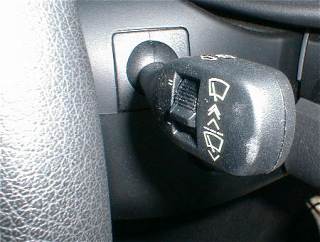 | 左折,右折用のウィンカーレバーです。左端のスイッチを押すと,メーターパネル内のドライビングコンピュータの表示が時計,外気温度計,平均燃費,予想走行距離に切り替わります。 | ワイパーのレバーです。高速,低速,間欠で切り替えられます。間欠は時間調整機能付きです。また低速のまま交差点等で停車すると間欠に,高速では低速に切り替わります。 |