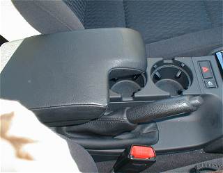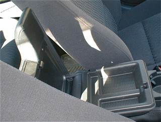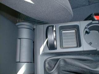 | ATレバーの後ろにサイドブレーキとアームレストが付いています。サイドブレーキのレバーは国産車より少し小振りなきがします。 | アームレストは上に上げられます。下には小さな小物入れと,コインホルダーがあります。 |
