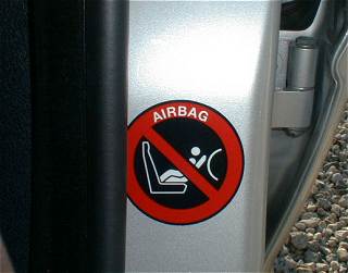 | 前席のドアの所についているものです。これは前の席にはエアーバッグが付いているので,チャイルドシートは使用しないようにとの注意だそうです。ここらへんの配慮はさすがですね。 |
