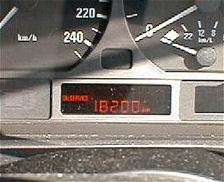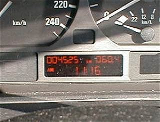 | メーター下のドライビングコンピューターです。エンジンを入れるとエンジンオイル交換までにキロ数が表示されます。BMWにいわせますと,25000kmまでオイルを交換しなくて良いそうです。驚きです。 | 上段左が距離の積算計,右上がトリップメーターです。その下に時間が表示されています。またここは切り替えスイッチで,外気温度計,平均燃費,予想走行距離,が表示できます。また外気温度が3℃以下になったとき,警告音を発し自動的に外気温度計に切り替わります。 |