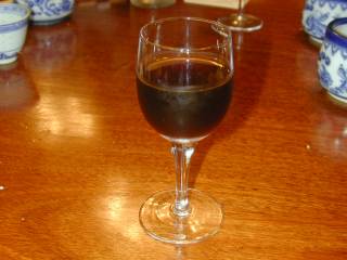 紹興酒は最初に1杯でました。その後3種類の紹興酒の飲み比べというものがあり,注文しました。紹興酒はその産地で味が異なるだけでなく,保存してあった「かめ」の位置(上,真ん中,下)でも違います。飲み比べるとその違いがよくわかります。口に含むとき舌の下に入れ,空気を吸うようにすると香りの違いがよくわかりました。またこれら以外にもう1種類飲み比べてみました。どの紹興酒がうまいかということは,飲んだ人で好みが分かれました。