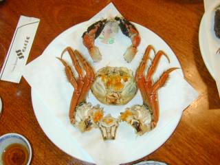| 最初お店に入り席に座ると,生の上海蟹を持ってきました。今回は4人で来たので,4ハイの蟹です。これを自分たちで選んで札に名前を付けます。そのあと蒸してくれるのです。できあがるまで時間がかかります。最初に蟹を決めたあと前菜等を食べていますと3品目にやってきたのが,下の写真の蒸した上海蟹です。当然自分にの名前の付いたものが自分の所にきます。身は少ししかありませんので「みそ」が一番の食べものだそうです。身の取り方もとても丁寧に教わりました。しかし,どうして蟹を食べ始めるとみんな無口になるのでしょうか・・・?。 |