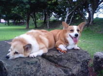 なにかというとゴロンと裏がえるナッツ。芝生の上はもちろんのこと、散歩中に犬好きの人を発見するとその場でゴロン。初対面の人であっても「お腹なでて」と要求したりもする。なので、「まあ、なんて無防備なワンちゃんだこと」、などといわれたりもするが、本人はご満悦。フランもナッツを真似て裏がえるようになり、ナッツが裏がえるとフランもすぐにゴロ~ン。 |